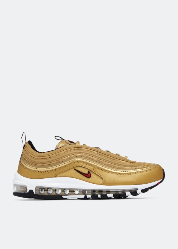 احتفالاً بالذكرى الخامسة والعشرين لنمط إير ماكس 97 الشهير، تُعيد نايك تقديم الحذاء بالألوان الذهبي المعدني، الأسود، الأبيض و"يونيفيرستي ريد". يتميز بطبقات جلدية بنمط مموج، وحدة "إير ماكس" وشعار السووش الشهير باللون الأبيض للمسة نابضة بالحياة.